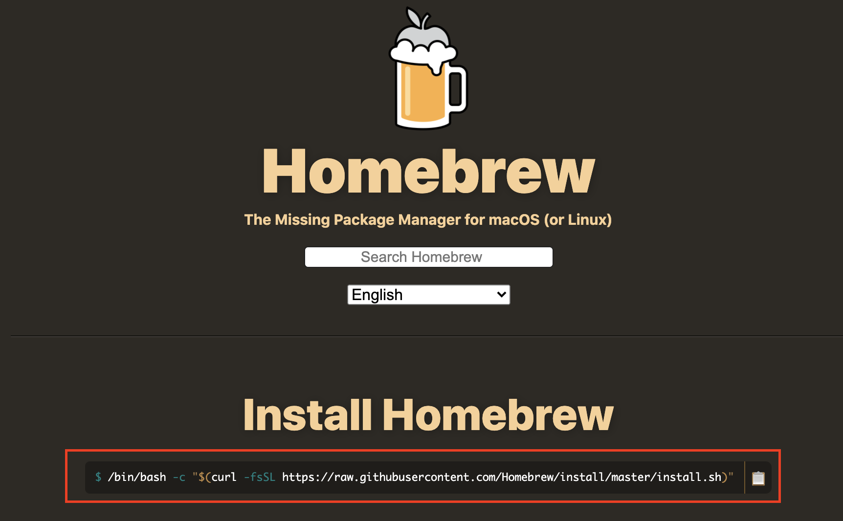 Install Homebrew 아래에 있는 명령어 복사하여 MacOS 터미널에 붙여 넣기 후 엔터 (설치 완료)